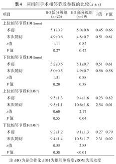 两组患者术前及末次随访时上位和下位相邻节段IDH差异均无统计学意义(均P>0.05)。两组患者术前上位和下位相邻节段ROM比较,其差异均无统计学意义(均P>0.05),而末次随访时,HO低分级组上位和下位相邻节段ROM均显著低于HO高分级组(t=2.54、2.31,均P<0.05)。两组患者末次随访时的上位和下位相邻节段IDH与术前差异无统计学意义(均P>0.05);HO低分级组末次随访时上位和下位相邻节段ROM与术前差异无统计学意义(P>0.05),而HO高分级组末次随访时上位和下位相邻节段ROM明显高于术前(均P<0.05)(表4)。