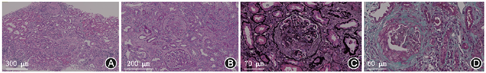 SSc合并AAV较为罕见。Kant等[3]对3 570例SSc患者进行回顾性研究,其中7例经活检证实为新月体性肾小球肾炎的患者均抗MPO阳性,表现为血尿、蛋白尿,血Cr升高或不升高;随访观察提示与SSc重叠的AAV临床表现与特发性AAV相似,可通过标准诱导治疗实现疾病缓解,并建议以免疫抑制剂维持缓解。根据欧洲抗风湿病联盟(EULAR)联合欧洲肾脏学会-欧洲透析和移植学会(ERA-EDTA)对AAV的治疗建议,本例患者有新出现的重要内脏受累(肾、肺)并可能危及生命,应选择大剂量糖皮质激素联合环磷酰胺或利妥昔单抗来诱导缓解[4]。一项纳入151例完成肾活检的寡免疫复合物沉积的肾血管炎的研究提示,新月体<75%的患者的1年和5年存活率高于新月体≥75%的患者,毛细血管外增殖和肾小球硬化是预后不良的重要因素[5],这对于不同组织学特点的AAV的预后判断及治疗方案制定有一定的指导意义。张清等[6]对46例AAV的回顾性分析提示进行性肾功能恶化是MPA的典型临床表现,严重的肾损害是AAV患者死亡的危险因素。当临床上考虑为RPGN且肾脏病变有恶化趋势但无法及时获取肾脏活检结果时,通常会尽早开始经验性的免疫抑制治疗(尤其是糖皮质激素冲击治疗)以减少不可逆肾损伤。本例患者肾穿病理新月体占25%,并且有肾小球硬化,遂予甲泼尼龙冲击及序贯足量糖皮质激素、联合环磷酰胺免疫抑制治疗后,病情好转,血Cr短时间内恢复至正常,且随访过程中一直正常。