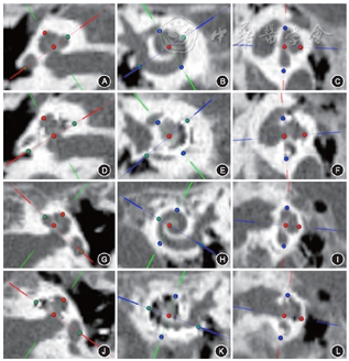 基于术前颞骨HRCT,使用OTOPLAN软件测量耳蜗底转长径(A值)、底转宽度(B值)与高度(H值),计算蜗管长度并选取合适的电极植入(图1)。在纳入的26耳中,有11耳(42.3%)的耳蜗发育情况较好,判断蜗管长度均>31.5 mm,选择全覆盖电极进行植入(图1A~C),术后行HRCT进行评估并使用OTOPLAN进行重建,耳蜗电极位置良好(图1D~F);有15个(57.7%)耳蜗判断蜗管长度<31.5 mm,选择植入标准电极(图1G~I),术后OTOPLAN重建图像示植入电极位置良好,可到达耳蜗顶转(图1J~L)。