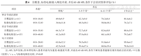 在双侧重度-极重度感音神经性耳聋患者中单侧植入基于OTOPLAN选择的全覆盖与标准电极均能带来明显的听力及生活质量改善,全覆盖电极植入可能会提升患者术后的言语识别获益。