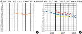 注:家系2患儿2020年听力图为纯音听力测试(PTA)结果,其余为听觉多频稳态诱发电位(ASSR)结果;不同的听力检测方法和条件均可能对听力检查结果产生一定影响,家系2患儿听力随访结果的波幅在中度感音神经性耳聋阈值范围内