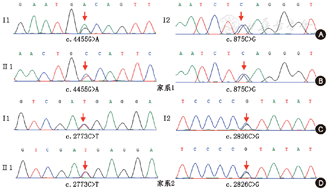 针对在受检者样品中所筛查出的可疑致病变异的位置,设计了4对引物,c.875C>G位点引物序列:上游5' TGGCGATAAATGCTTCACTG 3',下游5' TCTGTCTGACATGCCCACAT 3';c.4455G>A位点引物序列:上游5' TGTACACCATGGGCA ATATGA 3',下游5' TCACTTGAACTGGCCTTCCT 3';c.2826C>G位点引物序列:上游5' TGA ACTGGCAATATTCGTAAGG 3',下游5' TCAAAA ACACCTGGCAATCA 3';c.2773C>T位点引物序列:上游5' CCAATGTTGCTGTCACTTGAA 3',下游5' CAGGGACCAGCATACTTGTTT 3',用PCR进行相应DNA片段的扩增,并用Sanger测序对扩增产物进行测序,测序结果采用DNASTAR(Madison)软件进行分析,家系其他成员使用相同的方法进行可疑致病位点变异检测。