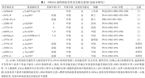 注:ACMG为美国医学遗传学与基因组学学会;PVS1(致病性很强):无功能变异(无义突变、移码突变、经典±1或2的剪接突变,起始密码子变异单个或多个外显子缺失);PS3(致病性强):体内、体外功能实验已明确会导致基因功能受损的变异;PM2(致病性中等):ESP数据库、千人数据库、EXAC数据库中正常对照人群中未发现的变异(或隐性遗传病中极低频位点);PP1(致病性支持):变异与疾病在家系中共分离(在家系多个患者中检测到此变异);PP4(致病性支持):携带变异的患者表型高度符合OTOGL基因变异导致的中度感音神经性耳聋;-示氨基酸改变、发病年龄或表型是否稳定尚不清楚