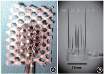由于ABI的听觉重建效果不甚理想,考虑到声音的高频反应区域位于耳蜗神经核的表面之下,无法被板状的表面电极有效刺激。因此,一种穿透式ABI(penetrating auditory brainstem implantation,PABI)电极阵列结构被构思出来(图1B),期望能通过刺入耳蜗神经核的微电极实现更有效的电刺激[6]。2008年Otto等[7]的研究发现,PABI可以降低ABI的阈值,激活高频听力,但患者言语识别率与传统ABI相比并未明显提高,该电极植入时对蜗核的创伤以及难以精准定位可能是潜在的原因。近年,有团队围绕着柔性材料进行新型ABI电极的设计及实验室研究[8],期望能更贴合蜗核表面结构,实现更有效的神经元刺激。