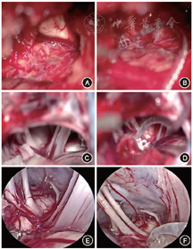 因ABI电极的靶点位置-脑干蜗核位于第四脑室外侧隐窝内(Luschka孔),手术径路通常采用迷路径路或乙状窦后径路[11, 12, 13]。迷路径路多用于NF2等肿瘤患者,其术野宽敞,可同时实施肿瘤摘除,是直接通向第四脑室侧隐窝的最佳角度(图2A,B)。而乙状窦后径路多用于先天性非肿瘤性患者(图2C~F),虽然该径路在探寻第四脑室外侧隐窝时难度更大(需要下压小脑、视角更倾斜),但其优点在于手术区域无需累及中耳、乳突,无需封闭咽鼓管或鼓窦,且不受面神经走形变异等影响。