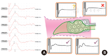 由于ABI电极的精确放置决定了听觉重建效果,考虑到肿瘤患者的局部结构多被肿瘤压迫变形,而非肿瘤患者多伴随蜗神经等畸形,且蜗核位于Luschka孔内,难以辨识;因此,术中电诱发听性脑干反应(eABR)辅助定位蜗核是一种常用技术(图3)[14, 15, 16]。同时,术中也应对面神经、舌咽神经、舌下神经、迷走神经等进行监测,以观察植入电极电刺激蜗核时是否会影响到周围的其他神经核团,出现非听觉反应。