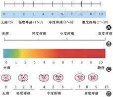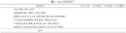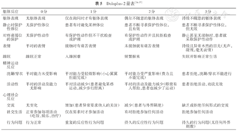 | 对疼痛部位的保护 | 无保护性动作 | 有保护性动作但不干扰检查或护理 | 有保护性动作并且抗拒检查或护理 | 静止甚至无接触时,患者就采取保护性动作 |