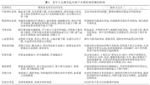 | 局部麻醉药 | 清除半衰期延长,清除率下降,对局部麻醉药敏感性增加,解剖改变(硬膜外扩散增加) | 阻滞时间延长,低血压风险增加,降低局部麻醉药总量和浓度;鼓励联合使用局部麻醉药和阿片类药物,改善镇痛效果,降低两者用量 |