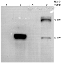 注:A为未转染质粒细胞裂解物;B为不含海肾荧光素酶四跨膜蛋白7细胞裂解物;C为不含四跨膜蛋白7空质粒细胞裂解物;D为含海肾荧光素酶四跨膜蛋白7细胞裂解物