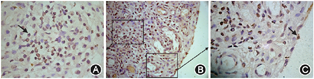 膝关节滑膜组织经固定、脱水和包埋后连续切片,分别行HE染色及免疫组化染色。在HE染色下采用Krenn评分评估病理滑膜炎程度[9],包括衬里层增生、衬里下层炎症细胞浸润和基质活化3个亚分,每个亚分根据相应病理改变的轻重程度进行半定量评分(0~3分),相加为Krenn总分(0~9分)。根据Krenn总分,0~4分为轻度滑膜炎,5~9分为重度滑膜炎。