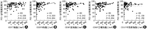 | 临床指标 | PGC-1β+细胞比例 | CD3+T细胞 | CD20+B细胞 | CD38+浆细胞 | CD68+巨噬细胞 | CD15+中性粒细胞 | ||||||