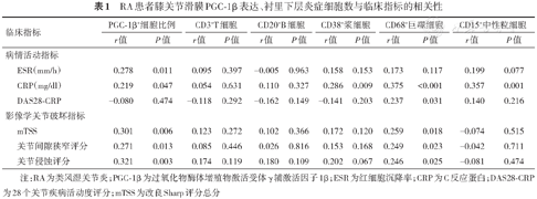 RA患者膝关节滑膜PGC-1β表达、衬里下层炎症细胞数与临床指标的相关性