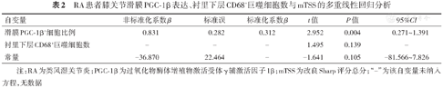 RA患者膝关节滑膜PGC-1β表达、衬里下层CD68+巨噬细胞数与mTSS的多重线性回归分析