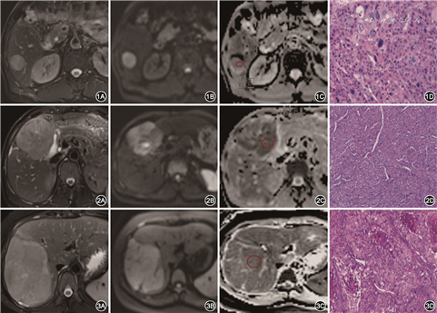 本文为横断面研究,回顾性收集2014年1月至2019年10月间在郑州大学附属肿瘤医院就诊的HCC初诊患者资料。纳入标准:(1)近期无服用肝毒性药物史;(2)术前无抗肿瘤治疗或手术治疗史;(3)切缘无肉眼可见的残留癌肿。排除标准:(1)图像质量差,影响ADC值测量;(2)不能耐受屏气者;(3)无手术病理结果者。共203例HCC患者纳入研究,男163例,女40例;年龄25~76(55±9)岁。所有患者均经过手术病理证实。分析所有患者的临床资料,203例患者中,有58例患者病理结果缺少分化程度的诊断,剩余145例HCC患者根据肿瘤分化程度分为3组:低分化组49例,中分化组67例,高分化组29例。203例HCC病例,经过6~36个月随访,获得完整随访资料175例,失访28例;复发病灶经过病理或穿刺确诊,或综合介入治疗、临床及影像学表现、最短6个月以上的随诊确定,最终96例患者确定复发,无复发79例。所有患者知情同意豁免。本研究符合《赫尔辛基宣言》对伦理的要求。