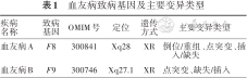 血友病主要分为A、B两个类型,致病基因分别为F8、F9,分别定位于Xq28和Xq27.1(表1)。从世界各地几千例血友病患者中检测出的大量突变来看,血友病的突变分子基础极为多样。血友病A的主要变异类型有倒位/重组、点突变、插入/缺失[9, 10, 11, 12, 13, 14, 15, 16, 17],血友病B的主要变异类型有点突变、缺失/插入[18, 19, 20, 21, 22]。