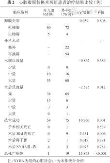 心脏瓣膜替换术两组患者治疗结果比较 (例)