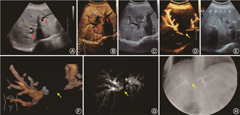 本研究发现CEUS和DCUS对肝门部胆管癌的分型诊断准确率均高于US。肝门部胆管癌中的管壁浸润型及结节型往往由于病灶沿管壁走行,存留胆管腔面积较大,梗阻上段胆管扩张不明显,往往易低估分型,而乳头型和硬化型由于梗阻程度较完全,常伴胆泥沉积,易高估分型。这与许尓蛟等[6]的研究结果US、CEUS、UG-PTC、CEUS+UG-PTC对肝门部胆管癌分型诊断准确率依次为73.3%、90.0%、86.7%、96.7%一致,可能因为增加了扩张胆管与周围感组织和其他脉管结构的声阻抗差异,易于显示梗阻端形态与其下属的各级胆管(图1)。DCUS对胆管癌分型准确率(93.3%)比CEUS(82.2%)略高,原因是DCUS弥补了CEUS间接成像缺陷、UG-PTC的二维空间缺陷、3D-USC对肝内4级以下胆管的显示不佳缺陷,可以实现图像实时三维旋转、胆管腔内及腔外改变,从而更准确地评估梗阻部位、梗阻程度及其侵犯的分支胆管、胆管树的解剖,有助于部分肝门部胆管癌患者术前提供个体化引流及精准外科手术治疗,特别是肝脏切除术前甚至在术中准确的划定手术风险、切除范围等,一定程度上降低肝门部胆管癌复发率、胆漏的发生率。而Urade等[7]提出术中超声胆道造影能准确提供可视化胆道树解剖,实时胆道导航。