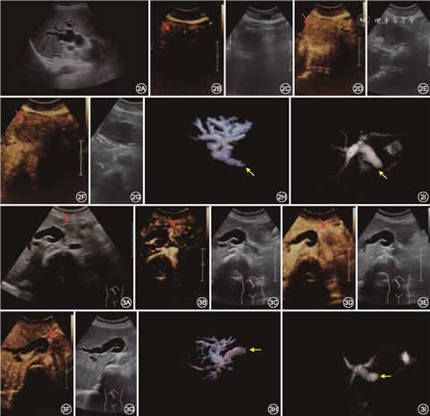 应用EPIQ 7彩色多普勒超声诊断仪(荷兰皇家飞利浦公司),配备的探头为C5-1、X6-1,探头频率为 1~5 MHZ,DCUS采用特异度低机械指数造影技术机械指数<0.2。超声造影剂为SonoVue(六氟化硫微泡,意大利Bracco公司),依据说明书每瓶药加入5 ml生理盐水,用力振摇后形成混悬液。CEUS于肘前静脉注入1.6~1.8 ml混悬液,可根据患者体重酌情调整。胆道造影按照1∶200的比例,即0.1 ml SonoVue混悬液加入20 ml的温生理盐水进行稀释,每次用量20~100 ml,经引流管匀速缓慢注入。