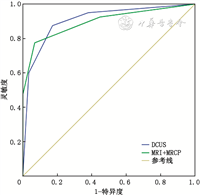 ROC曲线提示MRI+MRCP分级和DCUS分级诊断低位胆道梗阻的良恶性的临界值均为2.5级,该点灵敏度和特异度分别为77.5%、93.1%和87.5%、82.8%,AUC分别为0.897和0.906(均P<0.01)(图4)。