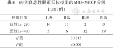69例良恶性胆道低位梗阻的MRI+MRCP分级比较(例)