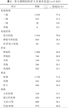 共收集到来自全国21个省级行政单位、402家医院、2 424名医护人员的问卷。问卷填写人员的所在医院级别、医院性质、科室、职业、职称等具体情况见表1。