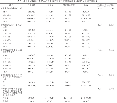在关于“中枢镇咳药可待因在体内可代谢为吗啡,存在成瘾性风险”的认知中,来自二级和三级医院的医务人员认知比例接近,显著高于来自一级医院的医务人员比例(χ²=9.240,P=0.010);对于制定肺癌相关性咳嗽的专家共识、诊疗路径和临床指南,不同级别医院均认为很有必要,差异无统计学意义(P>0.05),具体结果见表3。