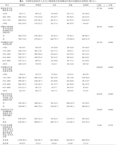 不同科室医务人员对于“可待因在体内可代谢为吗啡,存在成瘾性风险”的认知差异有统计学意义(χ²=82.629,P<0.001);针对院外随访的问题则显示,对于伴有咳嗽的肺癌患者是否有院外随访,不同科室间差异有统计学意义(χ²=79.829,P<0.001);对于制定肺癌相关性咳嗽的专家共识、诊疗路径和临床指南,不同科室均认为很有必要,差异无统计学意义(χ²=4.226,P=0.376),具体结果见表4。