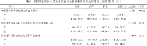 医师、护士和药师关于咳嗽对患者睡眠影响的认知相似。尽管多数医务人员知晓可待因成瘾性,但不同职业间差异有统计学意义(χ²=21.200,P<0.001)。医师、护士和药师关于福尔可定镇咳作用的认知均不足,且不同职业间差异有统计学意义(χ²=17.999,P<0.001),具体结果见表5。