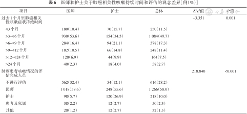 护士对于所负责的患者咳嗽持续时间的认知比例显著高于医师(Z=-3.351,P=0.001)。对于是否评估肺癌相关性咳嗽以及评估工作执行人的构成,医师和护士的认知差异有统计学意义(χ²=218.840,P<0.001),具体结果见表6。