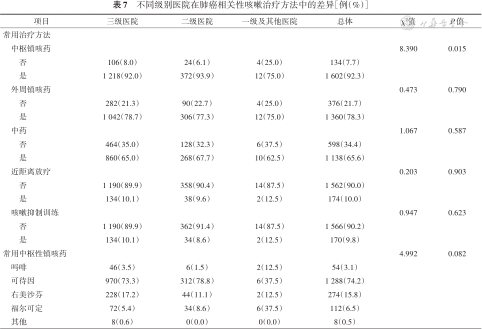 肺癌相关性咳嗽治疗的其他方式,如外周镇咳药、中药、近距离放疗、进行咳嗽抑制训练,各级医院之间差异无统计学意义。在病因治疗和药物治疗的同时,推荐有条件的机构或医师使用咳嗽抑制训练作为肺癌相关性咳嗽镇咳治疗的辅助方法[7]。本研究中不同级别医院采用咳嗽抑制训练的比例仅为10%左右,提示未来临床工作中应加强咳嗽抑制训练的应用,有条件的医院可作为基础的肺癌相关性咳嗽治疗方式。