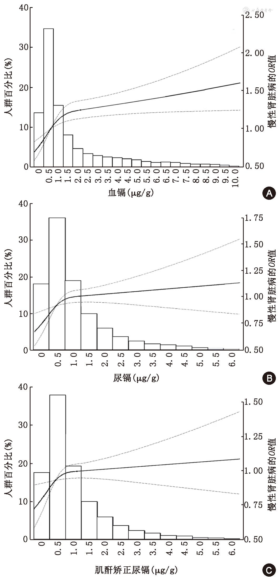 本研究存在一定的局限性。首先,本研究为横断面研究,无法明确镉与慢性肾脏病的因果关系,患有慢性肾脏病研究对象对镉等环境污染物的代谢、排出速率降低,引起镉在人体内的蓄积,可能造成反向因果关联。其次,由于蛋白尿的数据检测缺失率较高,本研究中慢性肾脏病的定义未纳入蛋白尿的指标,可能造成慢性肾脏病定义的错分偏倚;未定量检测尿微量白蛋白/肌酐及有关肾小管功能检查,未能探索镉与肾小管性蛋白尿的关联关系。最后,本研究检测的为血和尿中镉的暴露水平,未检测骨和肾中的暴露水平,可能造成镉暴露水平的错分偏倚。