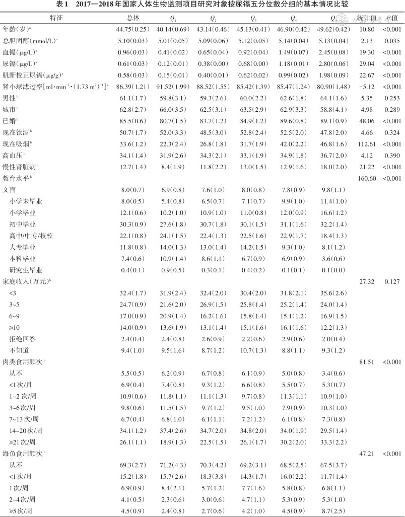 2017—2018年国家人体生物监测项目研究对象按尿镉五分位数分组的基本情况比较