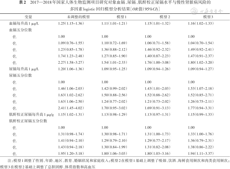 2017—2018年国家人体生物监测项目研究对象血镉、尿镉、肌酐校正尿镉水平与慢性肾脏病风险的多因素logistic回归模型分析结果[OR值(95%CI)]