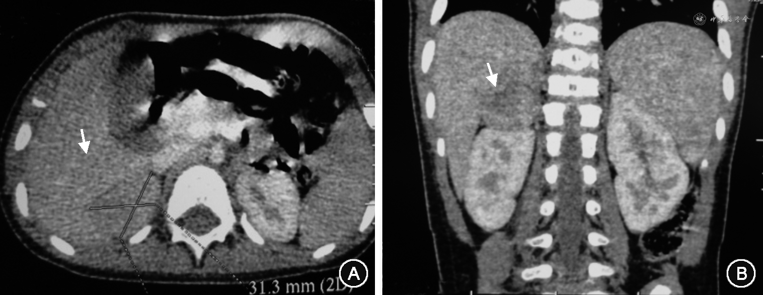为进一步判断雄激素来源,行中剂量地塞米松抑制试验:对照为睾酮2.19 nmol/L,17α-OHP 0.87 μg/L;服药后睾酮2.01 nmol/L,17α-OHP 0.69 μg/L,提示高雄激素未被抑制,且17α-OHP不高。进一步CYP21A2基因检测结果回报阴性,肾上腺B超及CT见右侧肾上腺实性占位,大小4.7 cm×3.1 cm×3.1 cm,边界清,分叶状,其内丰富血流信号,考虑右侧肾上腺皮质肿瘤(图1)。盆腔B超符合幼稚子宫,右附件区囊肿。2012年8月在北京儿童医院行肾上腺肿物切除术,术后肿块病理检查:大小4 cm×3 cm×2 cm,重20 g,切面实性,结节状。免疫组化:Syn+,CgA-,MelanA-,Vim+,钙网膜蛋白+,抑制素+,S100-,EMA-,Ki67 8%。考虑右肾上腺皮质腺瘤,且生长活跃。术后复查:睾酮0 nmol/L,孕酮0 μg/L,血皮质醇176.3 μg/L。查体:嗓音较前变细,阴毛3期,阴蒂增大较前好转,长度约1 cm。其后患儿规律随诊至2020年8月(9岁7个月),睾酮水平一直稳定在正常范围,但骨龄始终超过实际年龄。2018年10月(8岁9个月)查雌二醇 28.02 ng/L,睾酮1.11 nmol/L,骨龄相提示11岁,为减少对患儿终身高的影响,开始口服来曲唑 2.5 mg/次,隔日1次。2020年4月因乳房发育停用来曲唑。2020年8月患儿于本院随诊,查体:身高152.5 cm(>同年龄同性别健康儿童身高P97),体重41 kg,肤色稍黑。乳房2期,阴毛2~3期。肾上腺CT提示右侧肾上腺区术后改变,复查睾酮0.867 nmol/L。