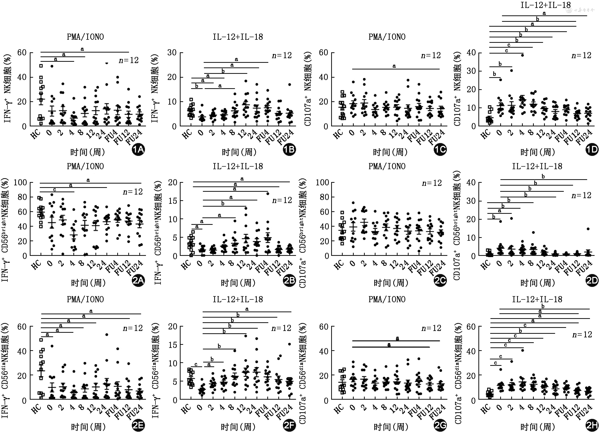 对NK细胞亚群进行分析发现,CD56brightNK细胞和CD56dimNK细胞产生IFN-γ和CD107a的水平与总NK细胞具有相同的变化趋势。但与DAAs治疗前[1.434(1.127,2.434)]相比,CHC患者CD56brightNK细胞产生IFN-γ的水平在治疗第8周[2.905,(1.133,4.664)]、12周[3.189(1.620,7.290)]、24周[3.282,(1.761,6.264)]和随访第4周[4.332,(1.077,6.868)]时显著增高(均P<0.05),且与HC组相比差异无统计学意义,但在随访第12周[1.640(0.910,2.391)]、24周[1.720(1.084,2.448)]时低于HC组[3.045(1.680,4.856)](均P<0.05);CD56dimNK细胞脱颗粒水平在治疗结束随访至第12周时较治疗前显著下降[7.224(4.767,9.211)比10.339(9.145,12.534),Z=-2.353,P=0.019],但至随访结束时仍高于HC组[6.803(4.379,9.181)比3.488(3.117,5.651),U=37.000,P=0.046](图2)。