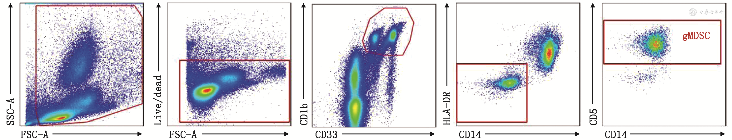 2. gMDSCs的流式分析:将新鲜分离的PBMCs浓度调整为1×107/ml,取100 μl置于5 ml流式管中加入抗体(CD33、CD11b、CD15、CD14、HLA-DR),混匀,室温避光孵育25 min;用1 ml PBS 1 500 转/min,5 min离心洗涤;弃上清,拍干;用200 μl 1%多聚甲醛液重悬细胞,4 ℃避光保存,24 h内上流式细胞仪检测,以CD11bhighCD33+HLA-DR-CD14-CD15+定义为gMDSC[4]。