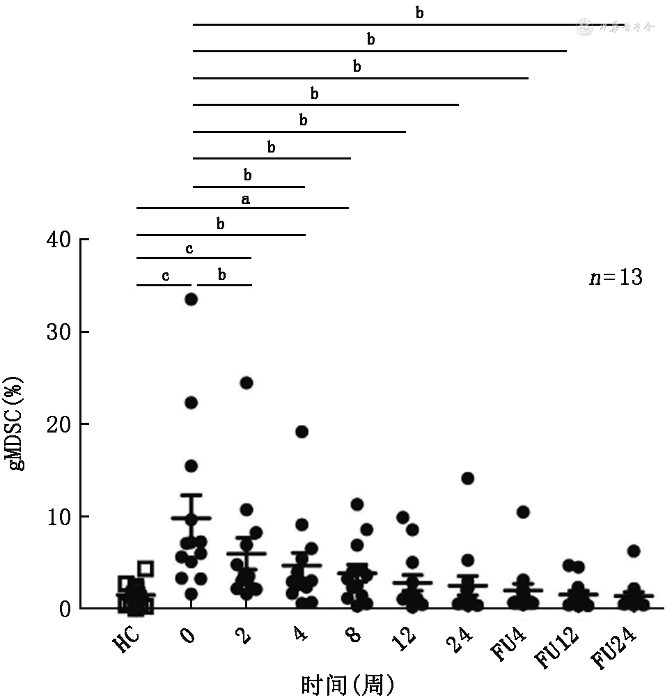 注:0、2、4、8、12、24分别为慢性丙型肝炎(CHC)患者达拉他韦(DCV)/阿舒瑞韦(ASV)治疗第0(治疗前)、2、4、8、12、24周;FU4、FU12、FU24分别为CHC患者DCV/ASV治疗结束后随访第4、12、24周;HC为健康对照组;gMDSC为粒细胞样髓源抑制细胞;aP<0.05,bP<0.01,cP<0.001