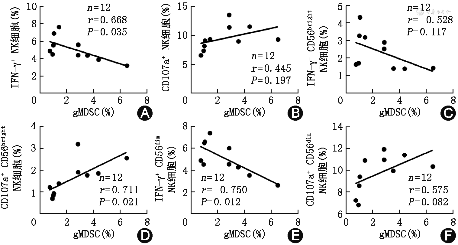 对CHC患者外周血gMDSCs百分比与NK细胞功能进行相关性分析,发现IL-12+IL-18刺激下,CHC患者治疗前外周血总NK细胞和CD56dimNK细胞产生IFN-γ的水平均与gMDSCs百分比呈负相关(r分别为0.668、-0.750,均P<0.05);随着gMDSCs百分比的增加,NK细胞及其亚群释放CD107a的水平逐渐升高,且CD56brightNK细胞脱颗粒能力与gMDSCs百分比呈显著正相关(r=0.711,P=0.021)(图5)。