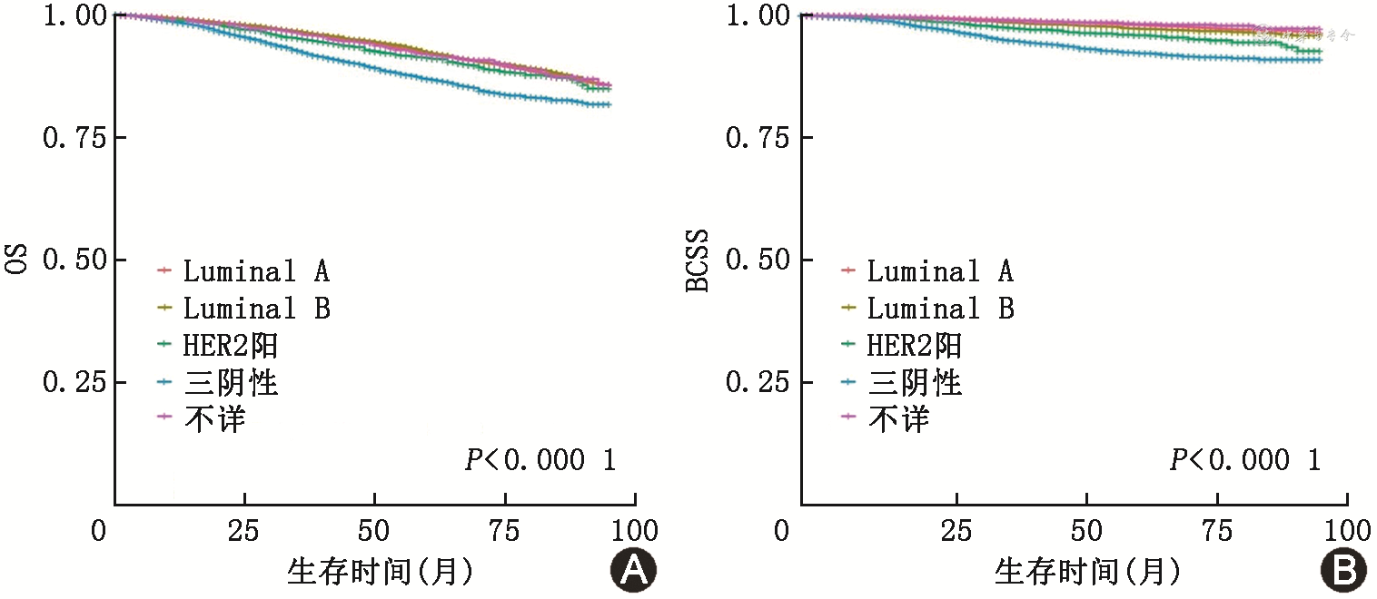 随访截止时间为2017年12月31日,主要观察指标包括总生存(OS)和乳腺癌特异生存(BCSS)。OS时间定义为从患者经病理确诊开始至死亡的时间间隔。BCSS时间定义为从患者经病理确诊为乳腺癌开始至患者因乳腺癌死亡的时间间隔。