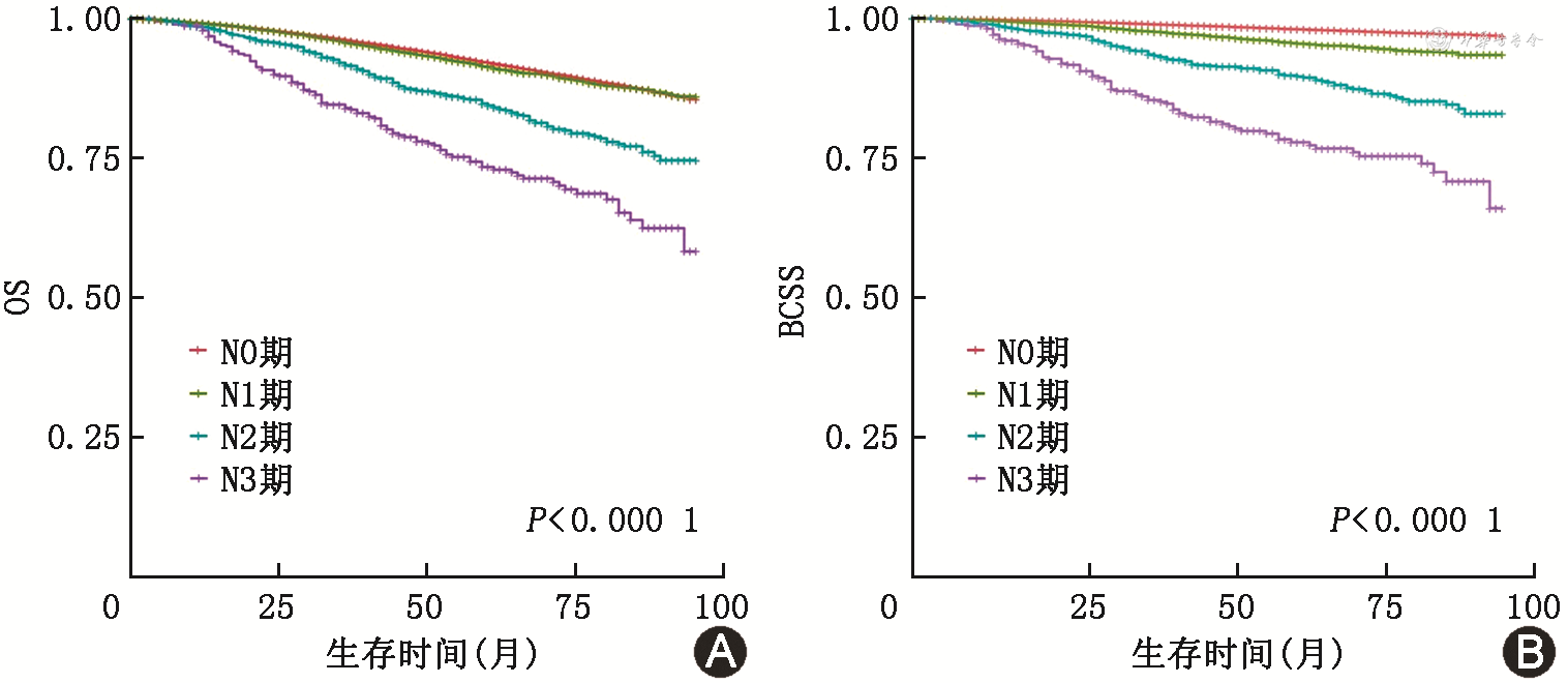 采用R语言(3.6.2版本)进行统计学分析,所使用的程序包包括multcomp、car、survival、survminer、ggplot2、ggpubr。根据N分期将所有患者分为N0、N1、N2、N3期4组,根据纳入临床病理特征对4组患者进行纵向分类,计算绝对数以及所占比例。采用χ2检验比较基线数据特征分布;采用logistic回归分析淋巴结转移影响因素;采用Kaplan-Meier生存分析获取生存信息及生存曲线;采用单因素log-rank检验分析各因素对OS以及BCSS的影响。将单因素分析有意义的变量引入Cox风险模型进行多因素分析,获得影响OS和BCSS的因素。所有假设检验均为双侧检验,取α=0.05。