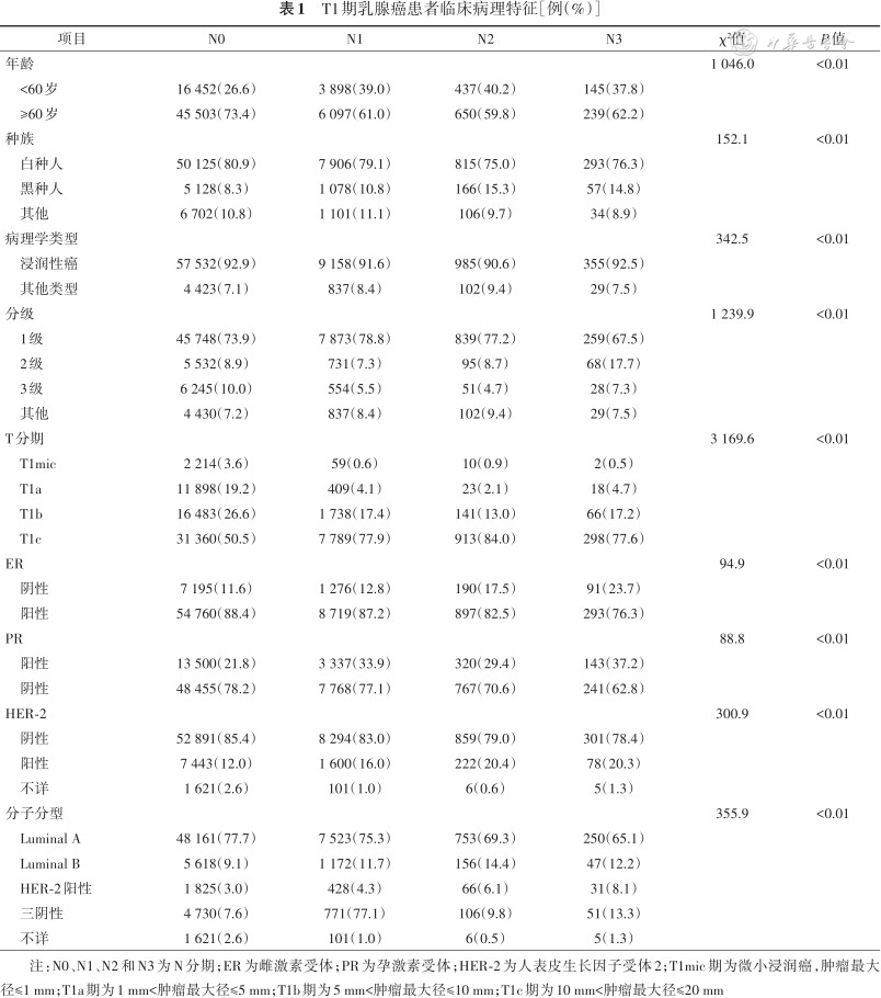 乳腺癌是中国女性最常见的恶性肿瘤,全国肿瘤登记地区女性乳腺癌的发病率为41.73例/10万人,同期乳腺癌死亡率为10.08/10万人,占全部女性恶性肿瘤死亡的7.54%[1]。随着诊疗技术的不断提高,早期乳腺癌所占比例不断提升。中国多中心研究显示,诊断为乳腺癌时,15.7%的患者处在Ⅰ期,44.9%处在Ⅱ期,18.7%处在Ⅲ期,2.4%处在Ⅳ期[2]。早期乳腺癌整体预后较好,淋巴结转移率较低,但原发肿瘤较小伴有腋窝淋巴结转移时,具有更强的侵袭性和更差的生物学行为。本研究基于SEER数据库,通过大数据水平研究T1期乳腺癌临床病理特征、预后以及淋巴结转移风险,为乳腺癌临床诊治以及全程管理提供新思路。