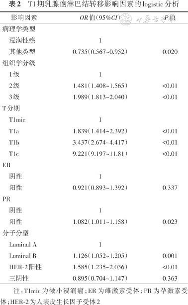 T1期乳腺癌淋巴结转移影响因素的logistic分析