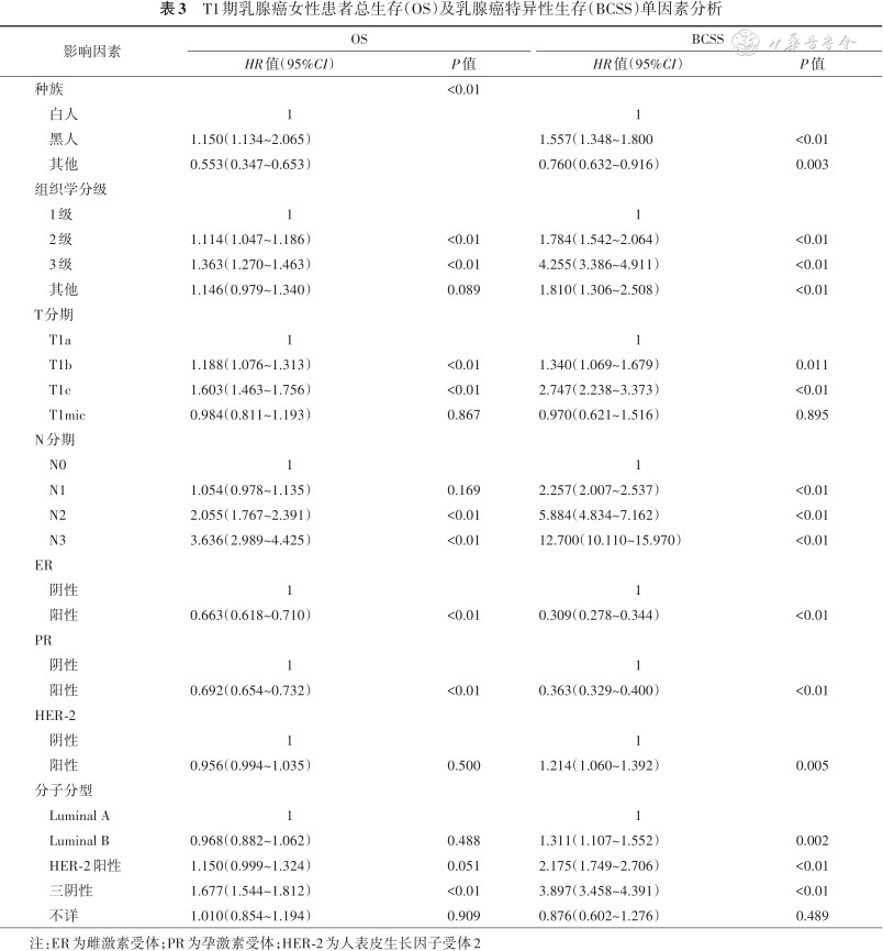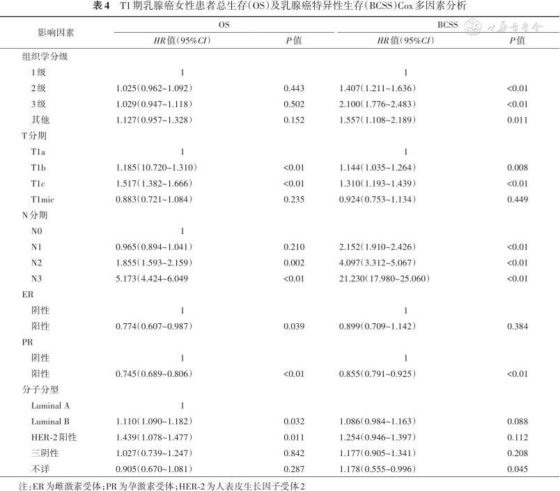 T1期乳腺癌女性患者总生存(OS)及乳腺癌特异性生存(BCSS)Cox多因素分析