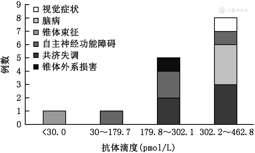 3. VGCC-Ab阳性LEMS的临床特征:VGCC-Ab阳性的LEMS共15例(15/18),抗体阳性率15/18,抗体浓度(260±139)pmol/L。抗体阳性和阴性组性别、年龄、MGC和肿瘤患病率比较差异均无统计学意义(表1)。抗体阴性组发病时程更长(7.6年比1.9年,Z=0.02,P=0.04)。根据VGCC-Ab滴度值均分为四组,VGCC-Ab较高时临床表现最丰富(图1)。