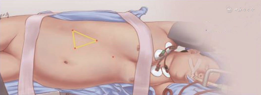 (1)体位及trocar位置:患者右侧卧位且尽可能贴近手术床边缘,腰部对准手术床的腰桥部位,确定患者冠状面垂直于手术床长轴,使患者腹部脂肪垂下手术床;右下肢轻度屈膝,左下肢伸直,胶带固定肩部及髋部。Trocar位置分别是:观察孔位于腹直肌外侧缘平脐上方2 cm,主操作孔和第二操作孔位于左季肋缘下,由于患者个体差异,二者的位置不固定,与观察孔构成等腰三角形即可,主要操作区域指向脾脏。