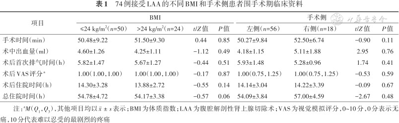 74例接受LAA的不同BMI和手术侧患者围手术期临床资料