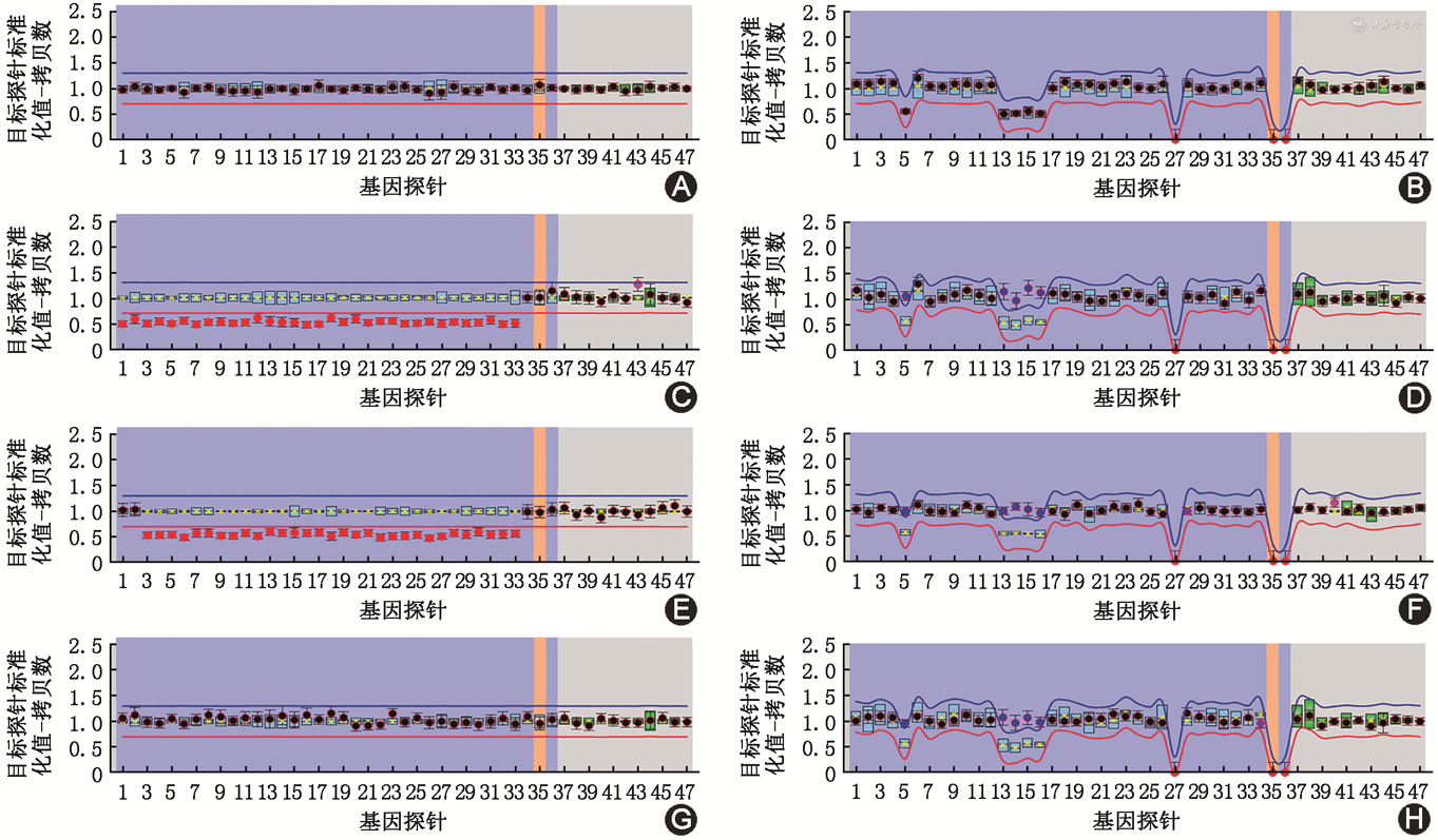 注:横坐标为基因探针(1为TUBGCP5-8;2为NIPA1-3;3为MKRN3-1;4为MAGEL2-1;5为MAGEL2-1;6为NDN-1;7为SNRPN-u1b;8为SNRPN-u1b;9为SNRPN-Intr.u2;10为SNRPN-Intr.u2;11为SNRPN-u5;12为SNRPN-u5;13为SNRPN-5;14为SNRPN-3;15为SNRPN-3;16为SNRPN-3;17为SNRPN-3;18为SNRPN-7;19为SNRPN-HB2-85-SNORD;20为SNRPN-HB2-85-SNORD;21为SNRPN-HB2-85-SNORD;22为UBE3A-9;23为UBE3A-4;24为UBE3A-3;25为UBE3A-2;26为UBE3A-1;27为UBE3A-1;28为ATP10A-15;29为ATP10A-1;30为GABRB3-9;31为GABRB3-7;32为OCA2-23;33为OCA2-3;34为APBA2-14;35为SLC9A2-2;36为ITSN1-12;37~47为参考探针)。浅蓝色方框代表通过对照样本所绘制的该探针拷贝数或甲基化的95%CI;实心圆代表目的探针,上下端线为该探针拷贝数或甲基化的最高和最低范围;平行红色及蓝色线条代表探针的拷贝数或甲基化的边界,高于此边界表示拷贝数或甲基化增多,低于此边界表示拷贝数或甲基化减少