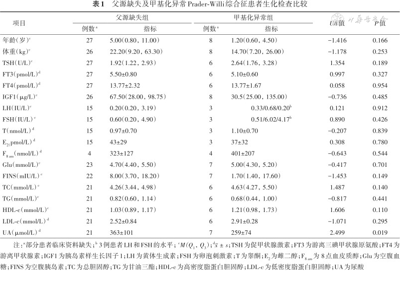 父源缺失及甲基化异常Prader-Willi综合征患者生化检查比较