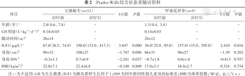 35例PWS患者中16例患者进行了规律随访,其中父源缺失组11例,UPD组5例。两组患者生长激素用量均为每天(0.14±0.03)U/kg,随访时间分别为(26.0±13.6)个月和(25.8±11.6)个月。治疗后,父源缺失组患者身高由(99.0±31.5)cm[(-0.3±1.1)同年龄同性别儿童身高标准差(SDS)]增加至(107.5±27.0)cm[(0.7±0.9)SDS],甲基化异常组患者身高由(86.4±31.2)cm[(-0.7±1.8)SDS]增加至(95.6±26.5)cm[(0.0±1.6)SDS]。治疗前后两组患者体质指数(BMI)差异无统计学意义(t=-0.140、0.324,P>0.05)(表2)。