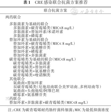 3. 以碳青霉烯类为基础的联合[23]:CRE对碳青霉烯类抗菌药物耐药程度不一,当对碳青霉烯类抗生素的MIC≤ 8 mg/L时,以碳青霉烯类为基础的联合方案对CRE有较好的协同作用,含碳青霉烯类的两药或三药联合方案要优于替加环素、多黏菌素或磷霉素的单药应用;当菌株对碳青霉烯类的MIC>8 mg/L时,不再建议选用含碳青霉烯类的联合用药方案。体外研究表明双碳青霉烯类(多利培南或美罗培南联合厄他培南)联合可增强抗菌作用,临床亦有双碳青霉烯类成功治疗CRE感染的案例报道[24]。